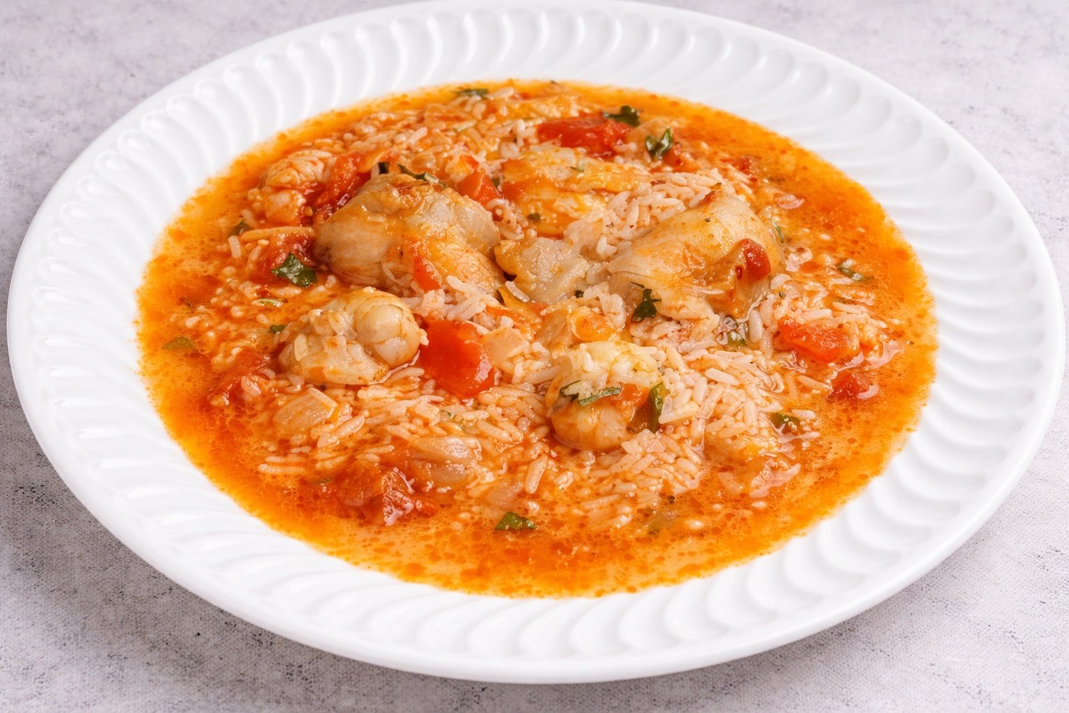 Um clássico português de textura “caldosa”, onde o arroz fica solto e envolvido num molho rico e aromático, com peixe firme e camarão suculento. O segredo está no controlo do tempo e do líquido.