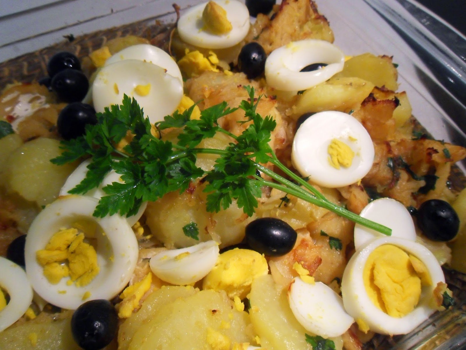 Transfira tudo para um tabuleiro, distribua por cima os ovos cortados em rodelas e as azeitonas. Regue com mais um fio de azeite.