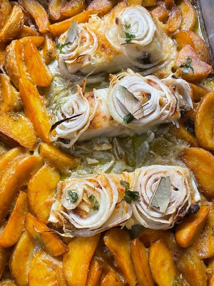 Bacalhau no Forno com Batatas Douradas e Cebola em Rosetas