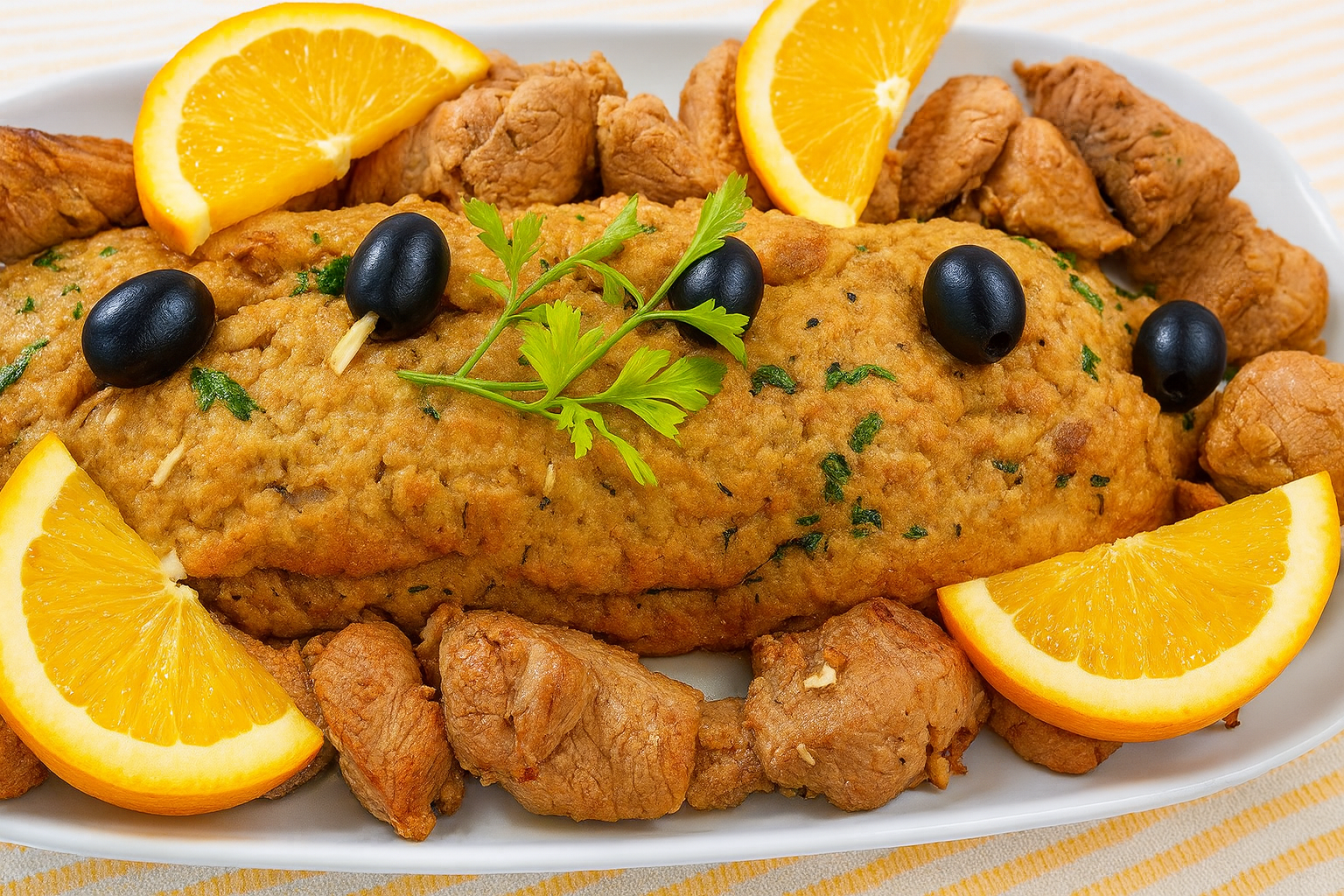 Servir as migas ainda quentes com a carne de porco, decorando com azeitonas e rodelas de laranja para um toque fresco e típico.