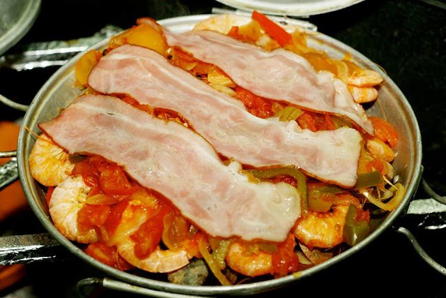 Junte os enchidos (chouriço e bacon) e depois o marisco maior.