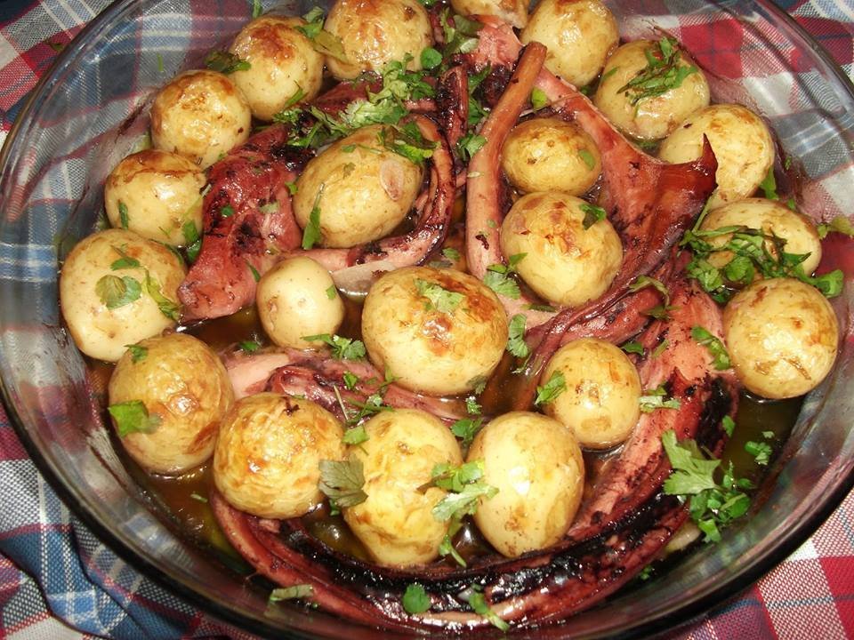 Polvo à lagareiro no forno, tenro e regado em azeite, acompanhado de batatinhas ao murro. Um clássico português simples e irresistível.