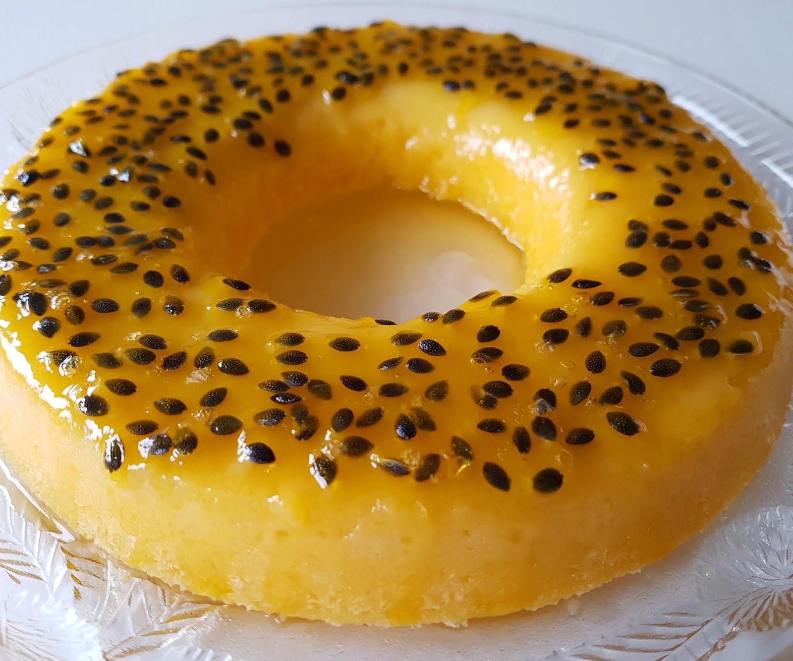 Retire o pudim do forno e deixe arrefecer um pouco. Desenforme ainda morno e regue com a calda de maracujá.