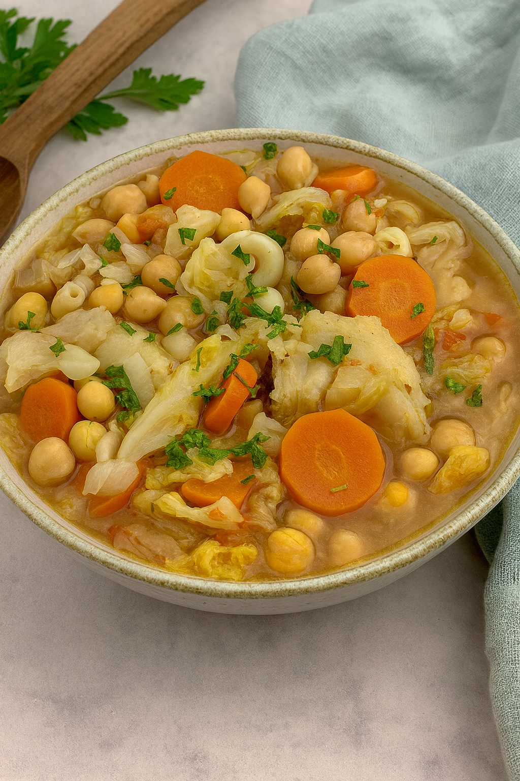 Uma receita diferente e cheia de sabor, perfeita para dias em que apetece uma refeição de conforto. O bacalhau combina com o grão, a massa e os legumes, resultando num prato nutritivo e delicioso, ideal para partilhar em família.