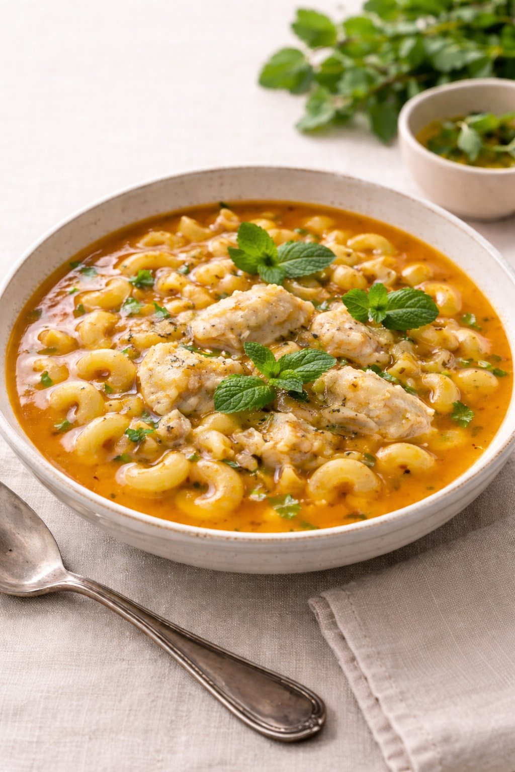 Uma sopa reconfortante e cheia de sabor, inspirada nas tradições da Estremadura, onde nada se desperdiça e tudo se transforma. Feita com um caldo rico de peixe, legumes aromáticos e massinhas, é um prato simples, nutritivo e perfeito para reunir a família à mesa — com o toque fresco dos poejos a dar-lhe identidade portuguesa.